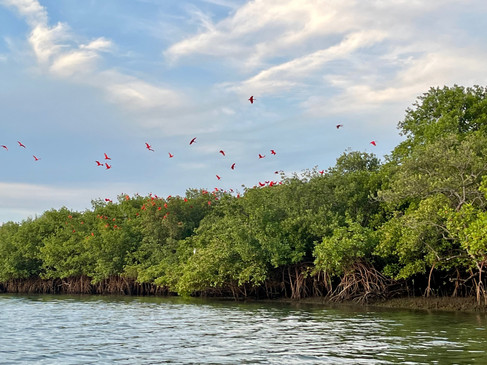 We took the opportunity to come closer to them by letting the dinghy drift in the wind in their direction or by paddling slowly in their direction. The best time was when we took the dinghy just before their return to the mangrove at sundown, dropped an anchor and stayed very quietly in the dinghy enjoying their dance in the skies as each chose which mangrove branch to land on. A fun show that only got better when two of the big blue Araras from the resort decided to do a fly-by at a low height just above the dinghy (nearly crashing into our heads) only to go scare all the Guarás and White Ibis that had already settled for the end of the day in the mangrove. As the Araras wreaked havoc on the mangrove all the Guarás took off scared at the same time dotting the entire sky with red. Oh, what a show!